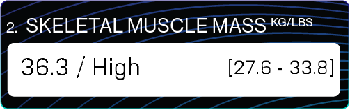Refers to the muscles attached to all the bones that you utilize for training and cardiovascular activity. In basic terms, high skeletal muscle mass produces more heat to burn fuel, i.e. giving you a higher BMR (basal metabolic rate - the rate at which your body burns calories at complete rest). A high metabolism is driven by increased amounts of skeletal muscle mass, together with sufficient protein intake which repairs and nourishes muscle cells as they break down (as well as assist in a host of other very important roles within the body i.e. hormone production, cell rejuvenation etc.)